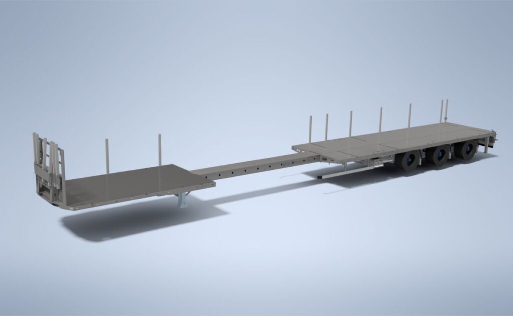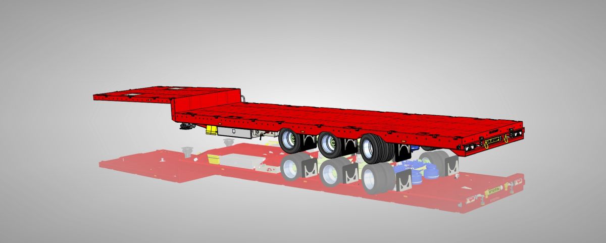 3-assige oplegger voor het vervoer van smalle, lange of hoge elementen zoals prefab-beton of panelen. Dankzij de onafhankelijke wielophanging realiseren we een ultra-lage laadvloerhoogte van 280 mm. - Semie-dieplader